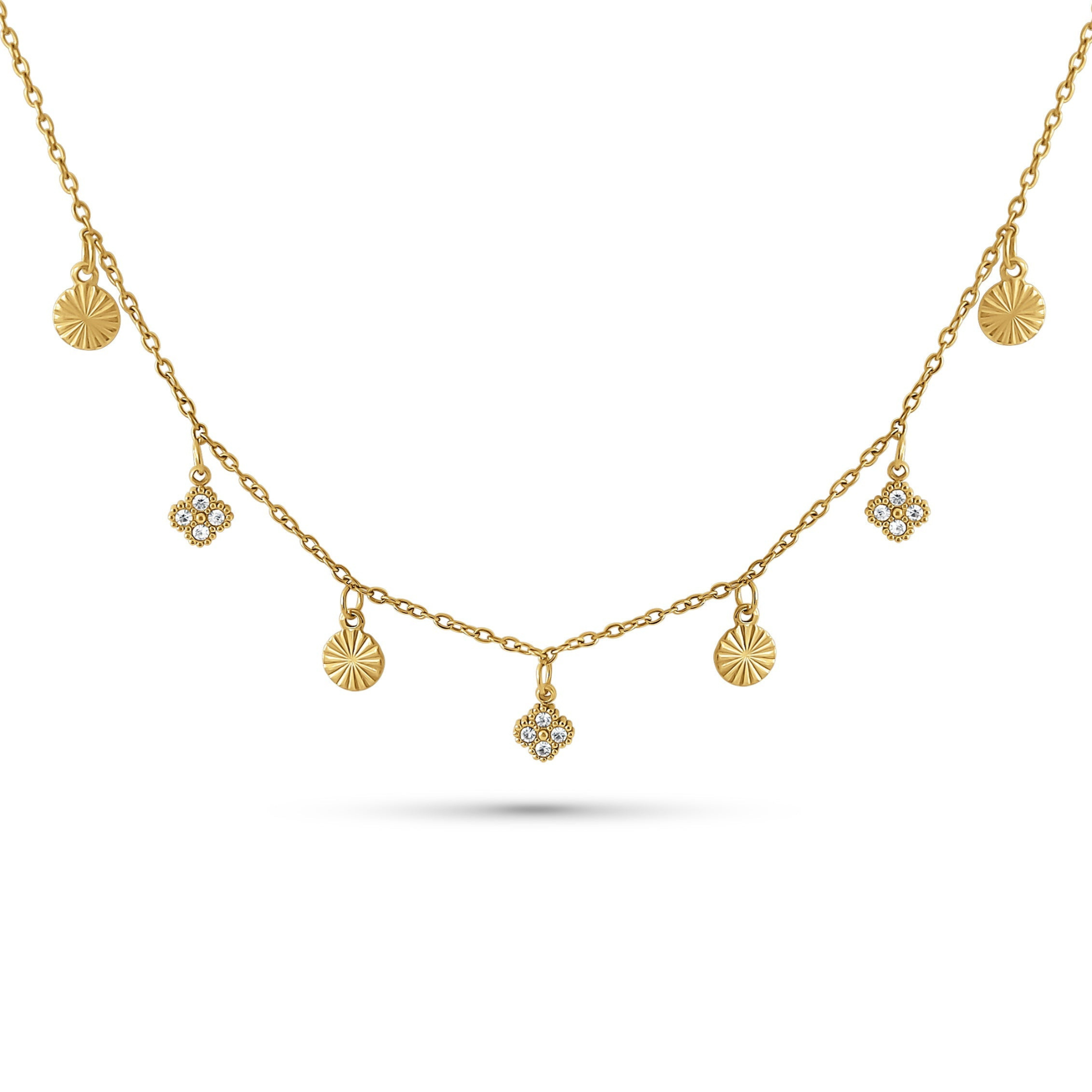 Softly radiant and beautifully detailed, the Clover Glow Necklace adds a golden touch of charm to any look. Its delicate clover and coin accents reflect light with every movement, creating an effortless glow that complements every style.